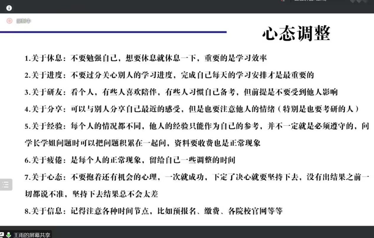 会议邀请了考研拟录取的肖瑶、陈思琪、陈欧翔等七位同学作为嘉宾分享各自的考研经验。他们从备考的时间安排、公共课和专业课的学习策略、备考中心态的调整、退役大学生在考研中享受的优惠政策以及如何了解调剂信息等方面的做了细致的讲解。