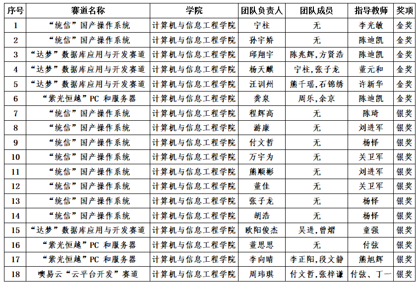 2023年5月28日于湖北工业大学举行的第二届湖北省大学生信创大赛中,我校计算机与信息工程学院学子喜获佳绩,获得6项金奖,12项银奖。
