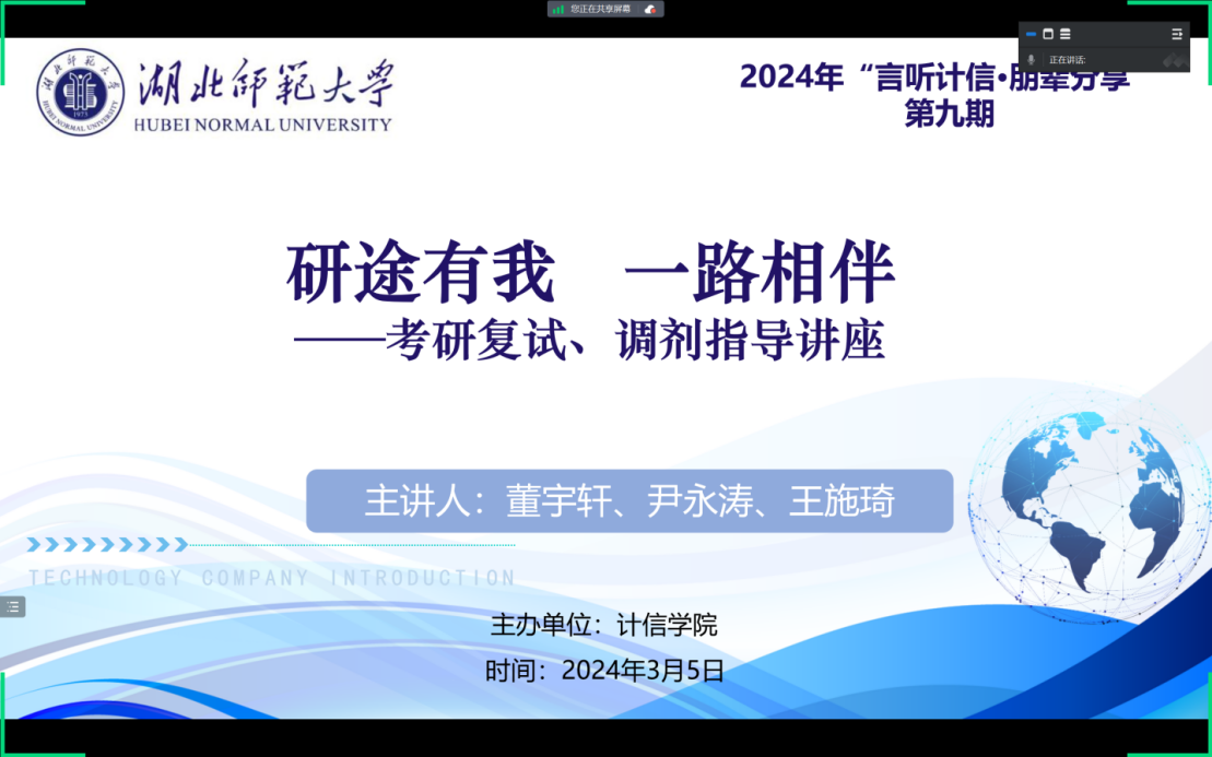 3月5日晚,计算机与信息工程学院举办了2024年“言听计信·朋辈分享”第九期主题为“研途有我,一路相伴”的考研复试、调剂指导讲座。学院邀请了2023年录取为在读研究生的尹永涛、董宇轩、王施琦三位优秀毕业生分享了自己的考研复试、调剂的相关经验,计算机与信息工程学院2020级部分考研学生线上观看并提问。辅导员卢老师主持此次讲座。