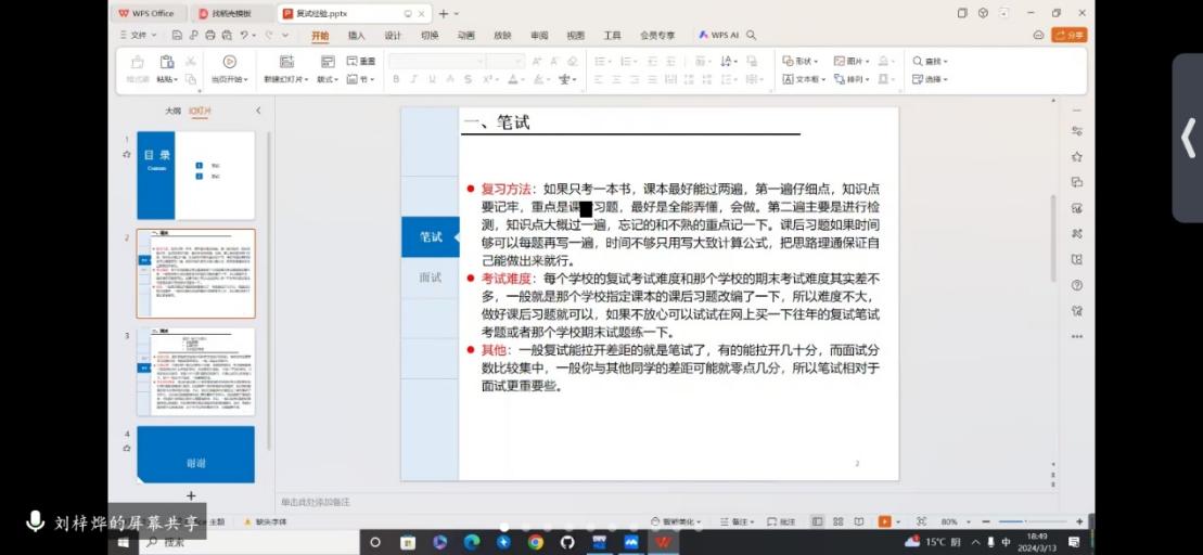 四位同学来自不同院校的不同专业,他们结合自身经历,从考前准备,简历准备,模拟复试,专业课笔试、面试流程,面试技巧,心态调整,临场发挥,细节完善等多个方面进行针对性、指导性分享,强调“不打无准备之战”的同时一定要自信诚实。张一涵从简历完善,回答面试中专业知识进行分享,并列举相关细节和技巧;舒信介绍了笔试题型,结合自己的经历提供相关专业课笔试范围,并建议“不要让面试冷场”;刘梓烨着重介绍笔试复习方法、技巧,强调准备要有规划,这样复试时才会心中有本;李舒琦提出要展现自身良好的综合素质,简历撰写突出个人优势,关注当前学术热点,做对话的主动者等方面。