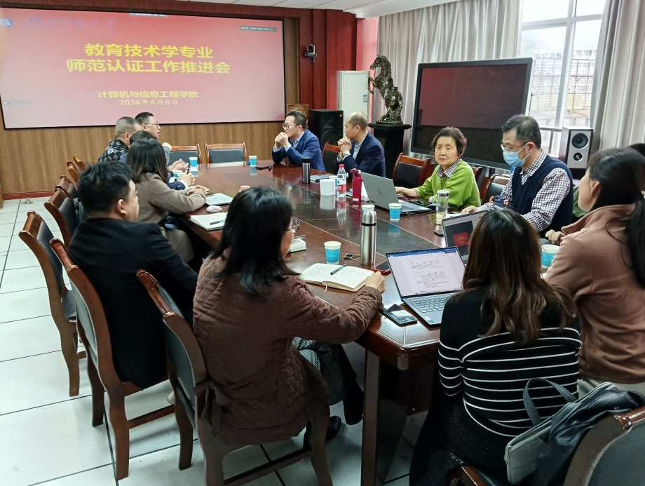 2024年4月8日,计信学院在1715会议室召开教育技术学专业师范认证工作推进会。师范认证专家组成员、教务处处长胡艳军教授,教务处督导吴瑞霞教授应邀指导工作,党委书记王舒怀、副书记刘健、副院长童强以及各组组长和小组成员参加会议。