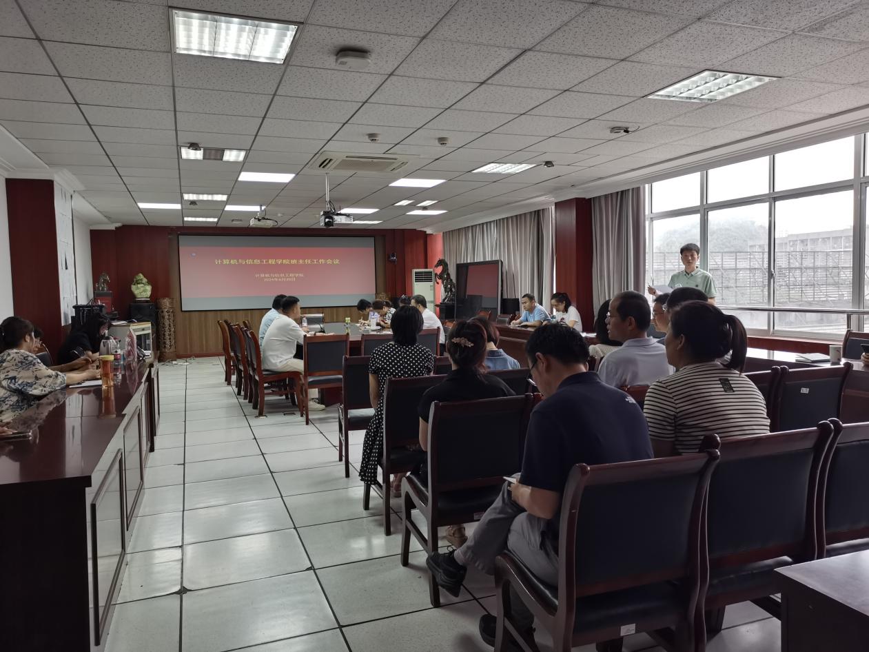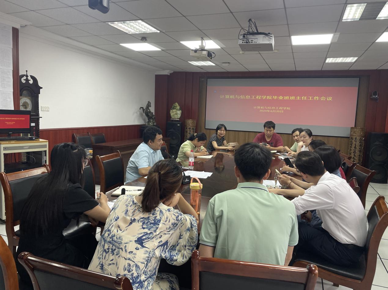 为进一步加强班主任队伍建设,落实好近期重点学生工作,计算机与信息工程学院于2024年6月20日在教育大楼1715会议室召开6月份班主任会议,此次会议由学院党委副书记刘健主持,学院全体班主任、辅导员参会。