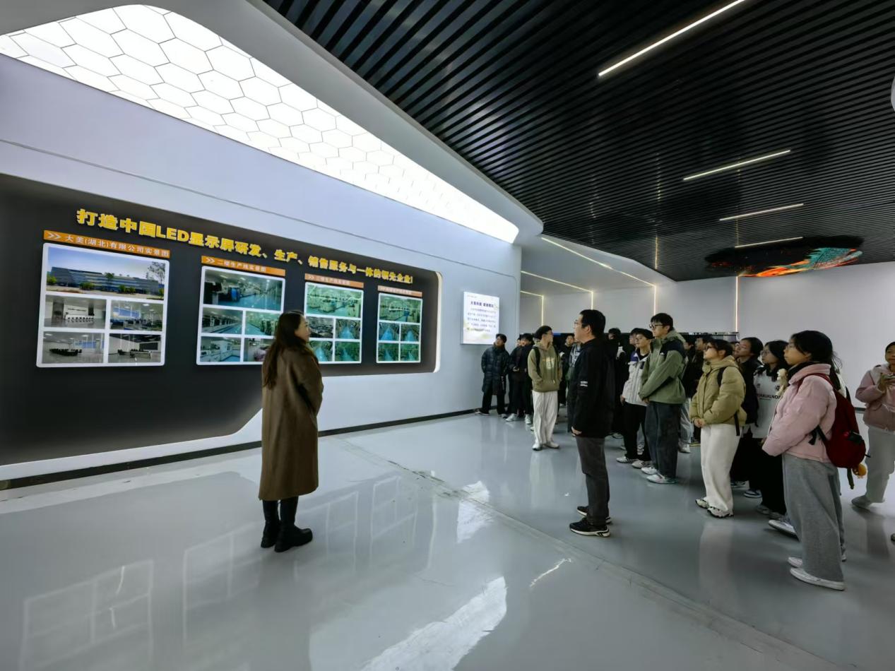 2024年11月29日,FUN88乐天使计算机与信息工程学院通信工程专业的学生们在黄石市经信局和学院的联合组织下,开启了一场主题为“科技启航,青春见习——走进电子行业前沿”的见习活动。2023级全体学生由经信局中小企业中心沈才青、李保庆和指导老师胡白燕、文富荣、阮青劲、漆琳老师带队,集体乘车前往大美科技(湖北)有限公司。学生们在企业负责人的带领下参观了公司研发中心和生产线,并进行了简短的企业介绍和技术分享。随后,学生们转场至湖北省腾触电子有限公司,重点了解了通信技术在显示领域的应用,并听取了技术专家对行业发展趋势及公司创新项目的讲解。