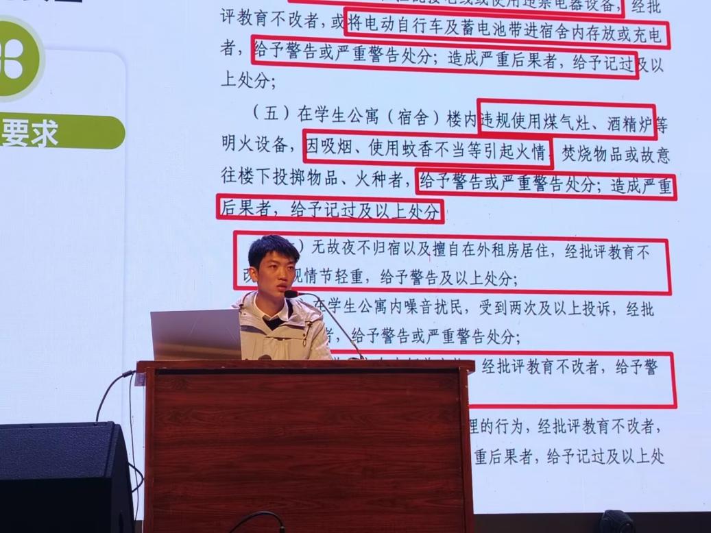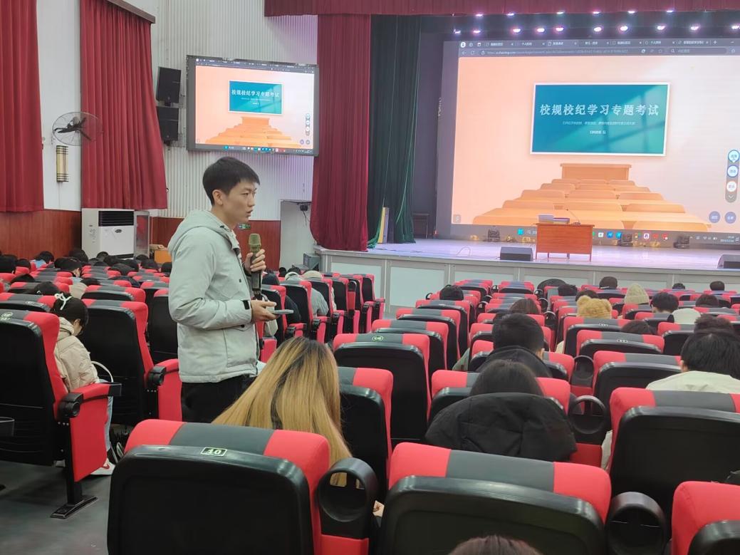 随后,张老师结合自身丰富的教学经验,向同学们分享了切实有效的复习迎考方法。他建议同学们制定合理的复习计划,加强练习并及时查缺补漏。另外,为增强同学们对学校相关规章制度的了解,会议还开展了校规校纪专题学习及考试,内容涵盖安全教育、学位授予、违纪处理办法等方面,要求全体学生认真学习相关文件,并在日后的学习生活中严格遵守相关文件精神。